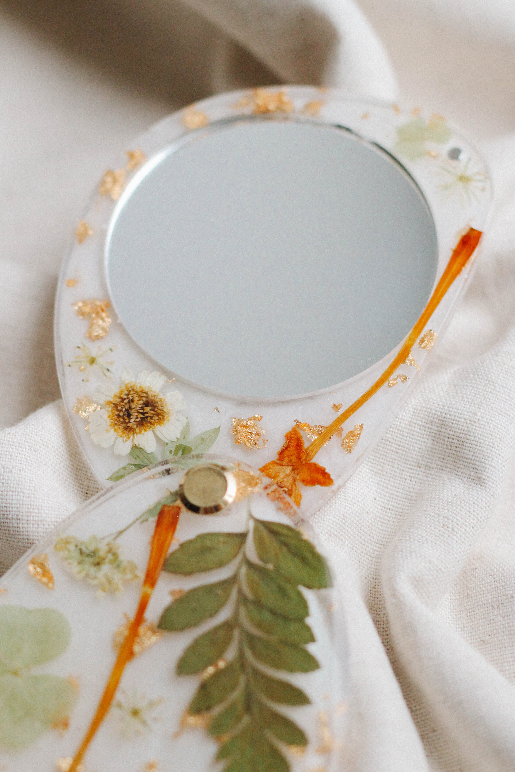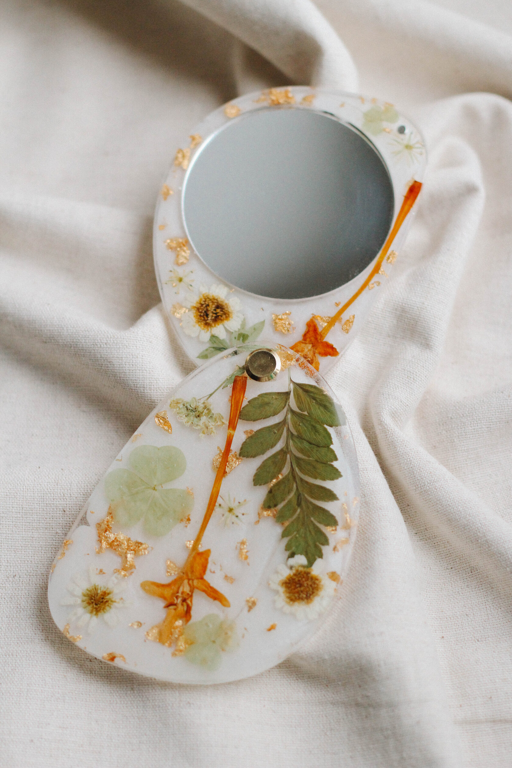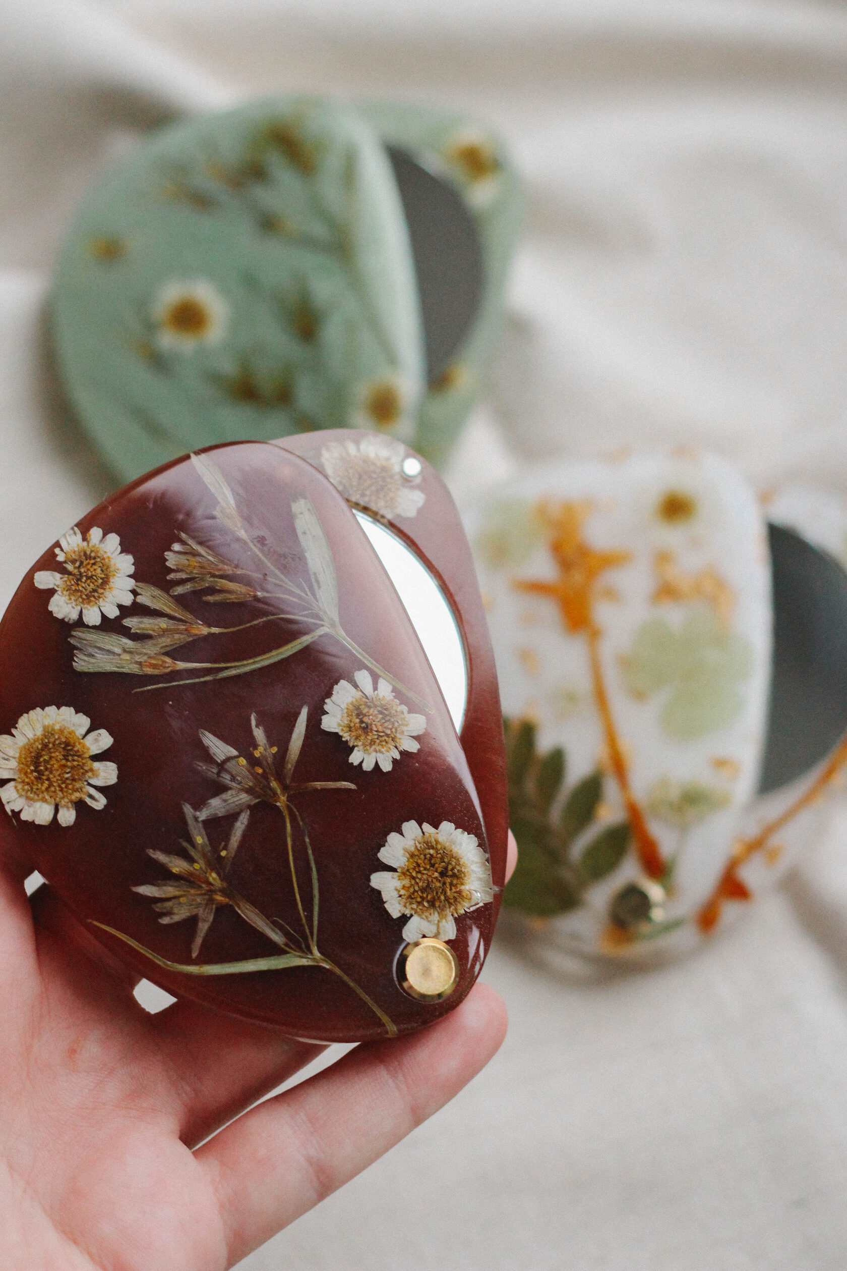 Материал: Эпоксидная смола, натуральные растения, зеркальный акрил. Размер: 9,5 х 7 см. Диаметр зеркала: ~6 см