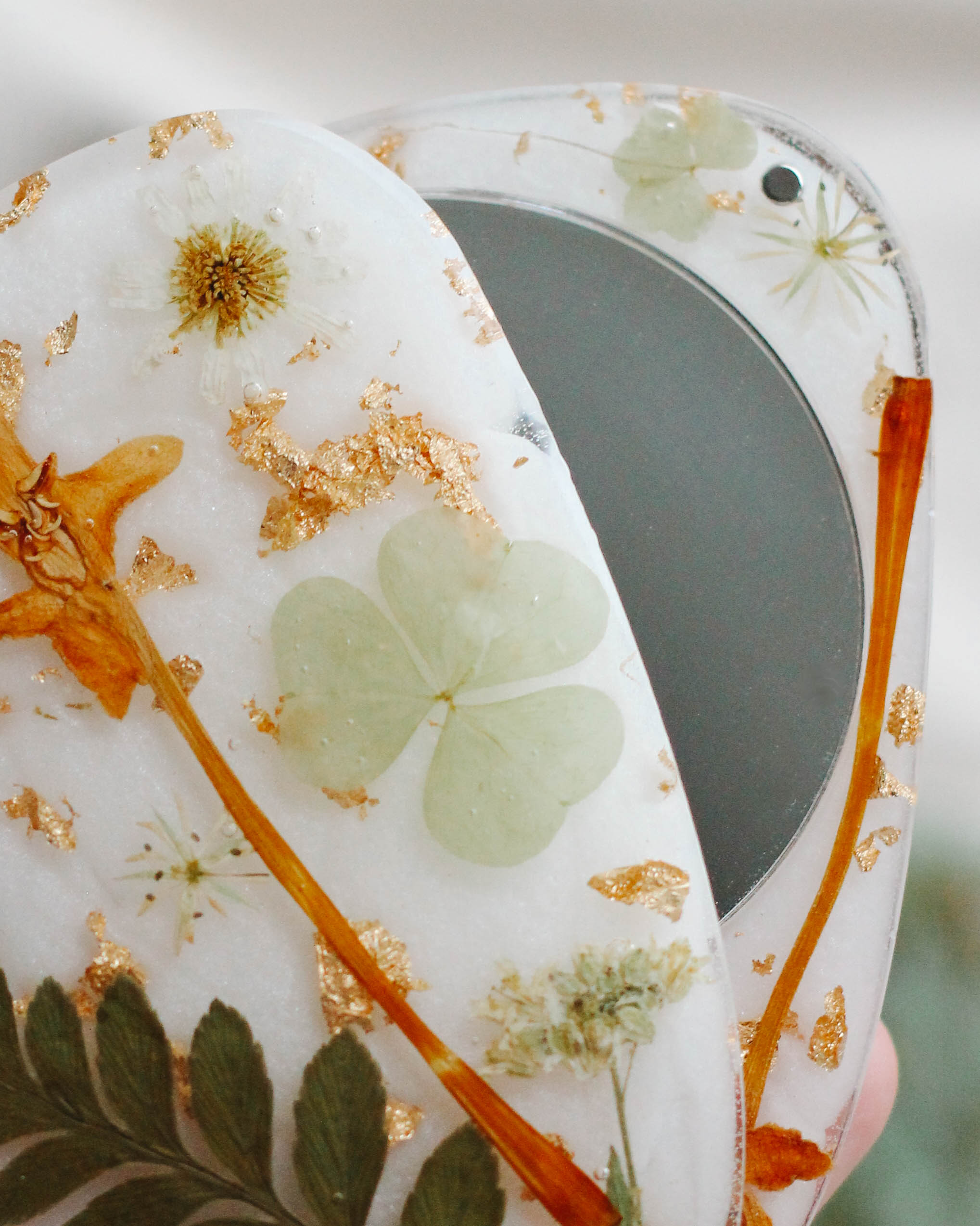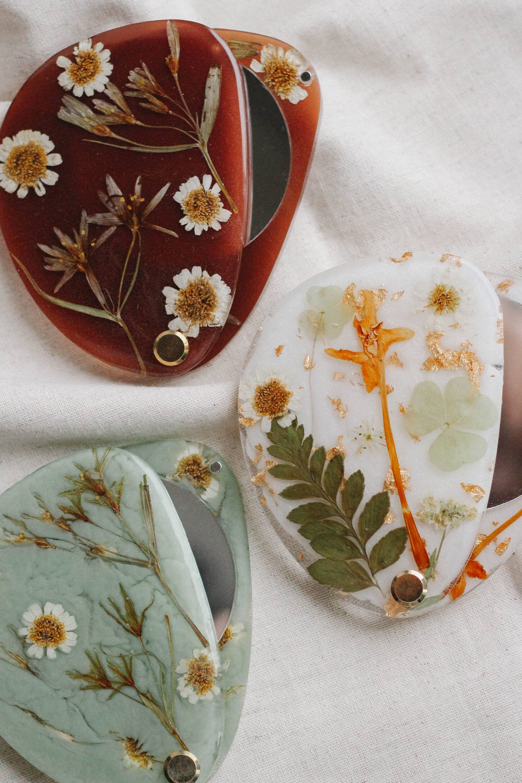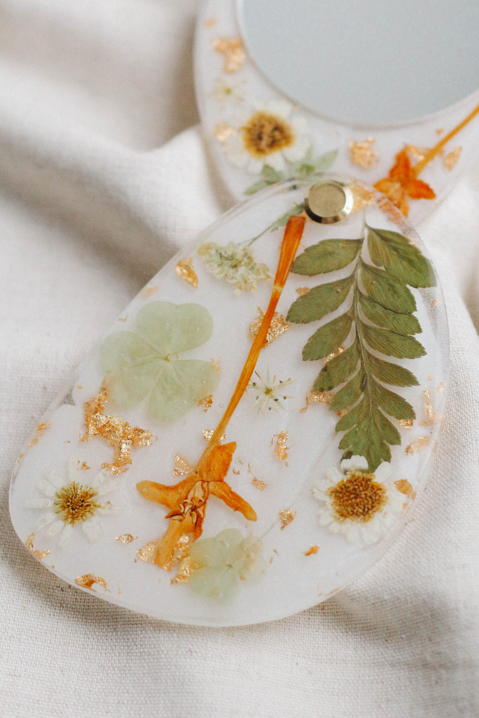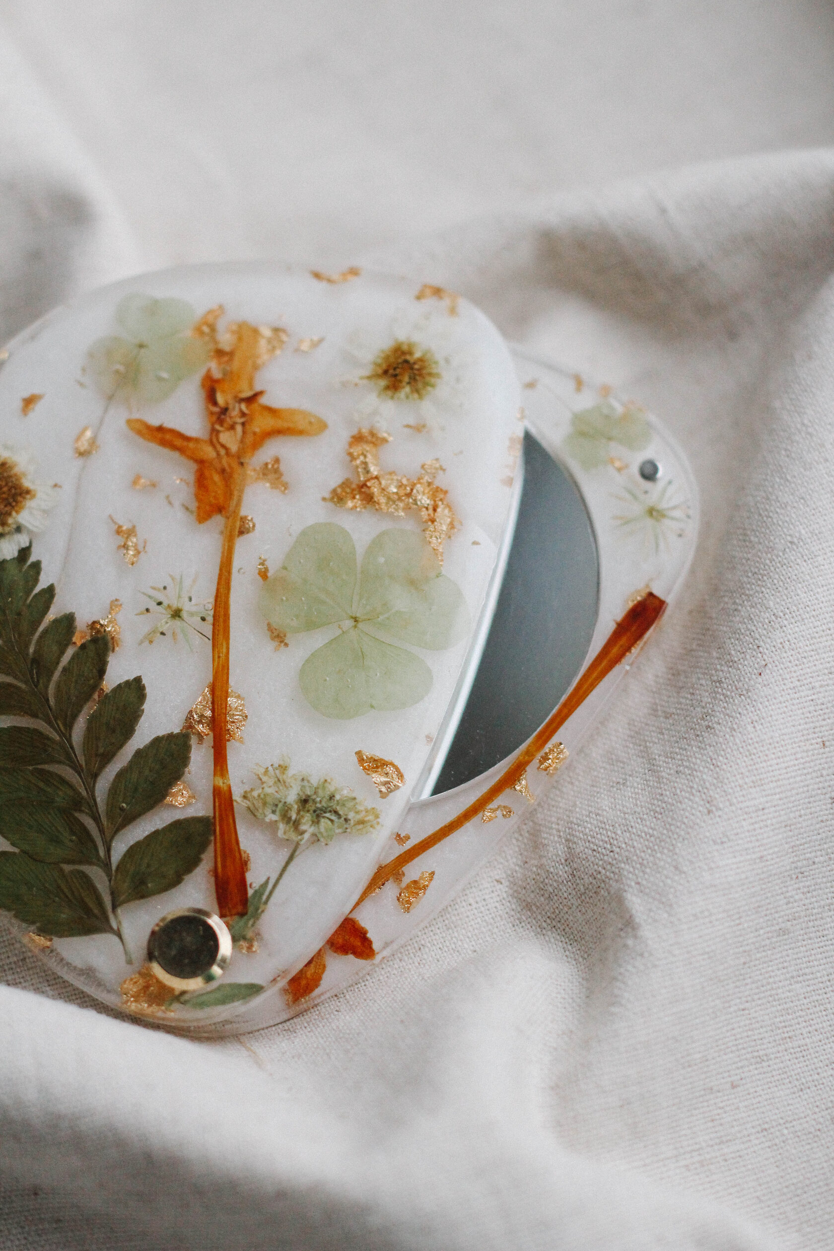 Материал: Эпоксидная смола, натуральные растения, зеркальный акрил. Размер: 9,5 х 7 см. Диаметр зеркала: ~6 см