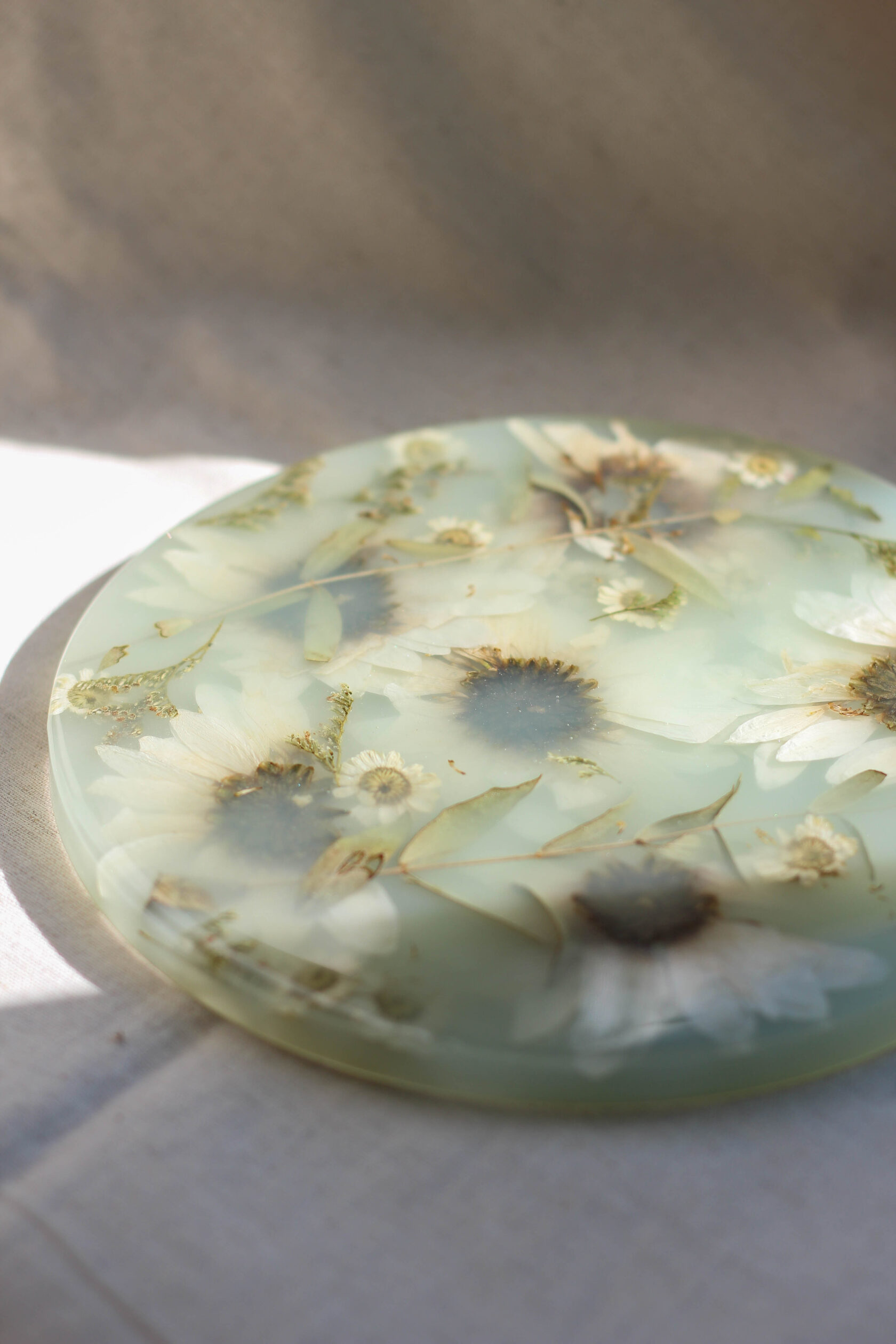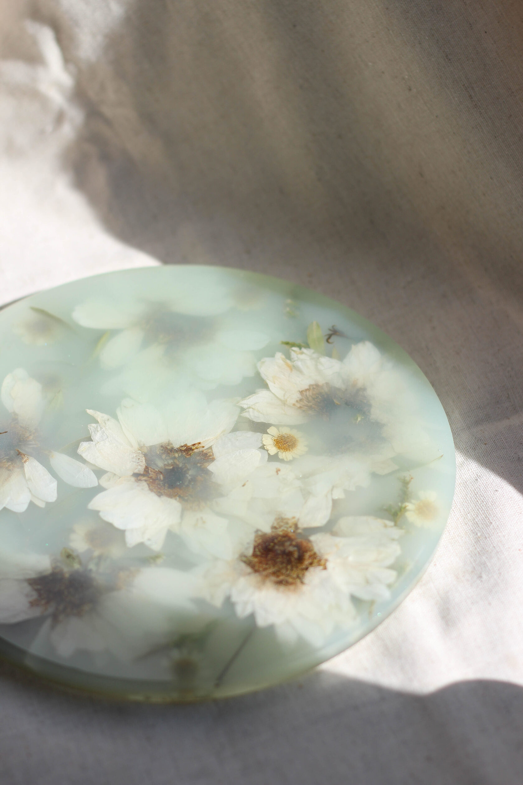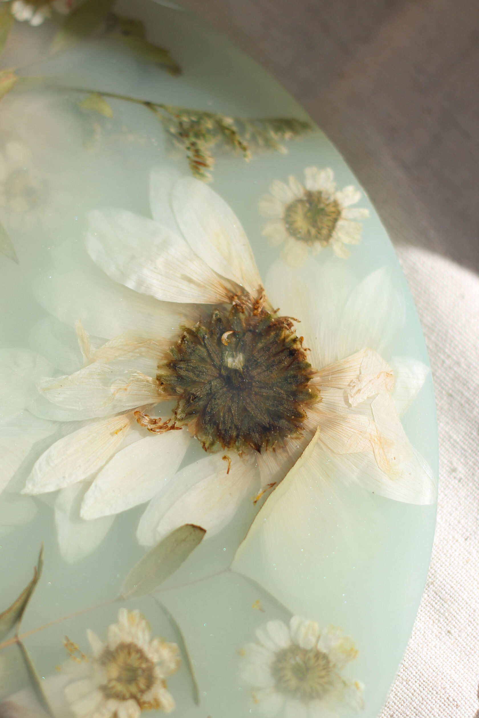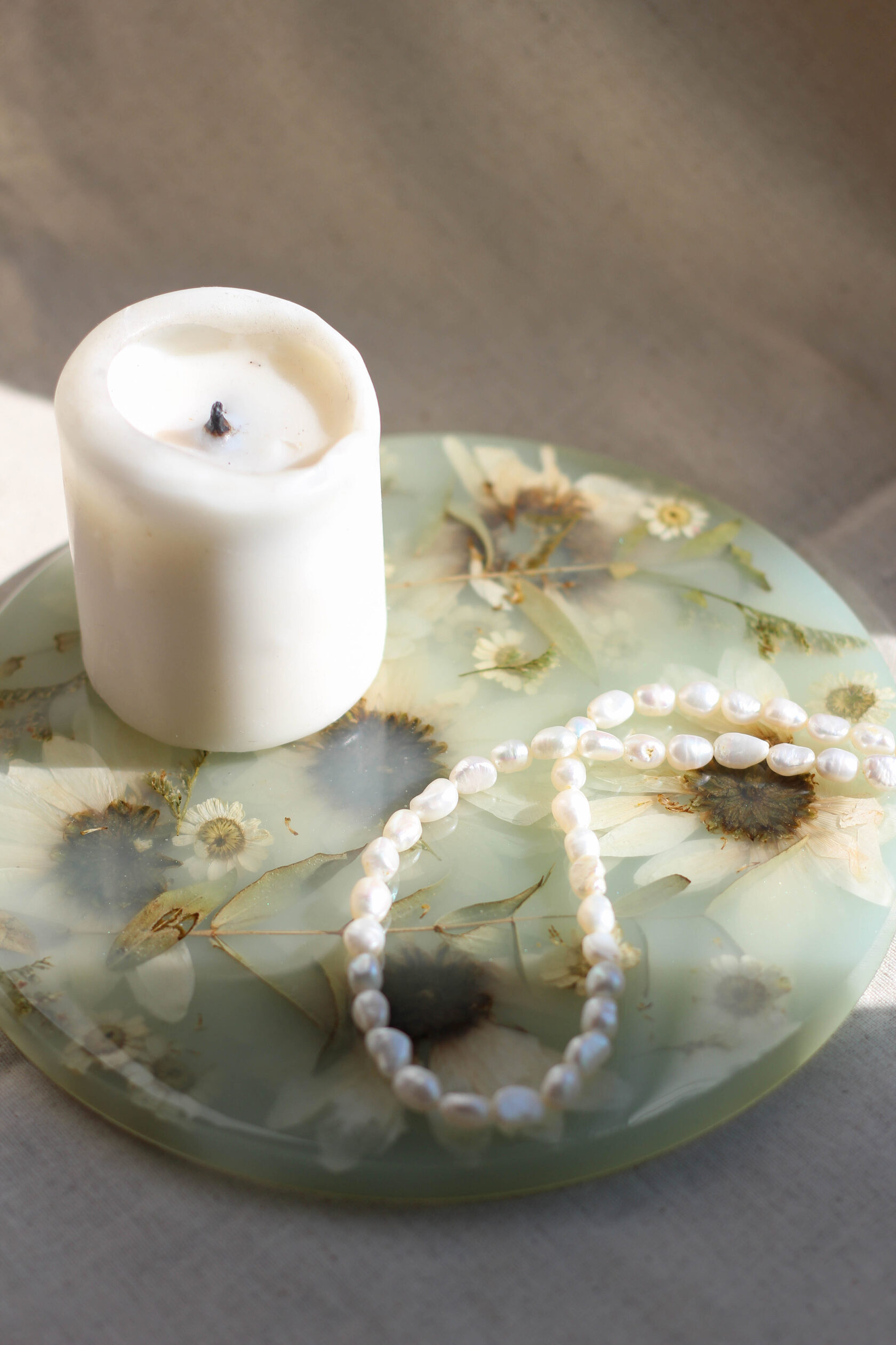 Элегантный подиум из эпоксидной смолы с настоящими цветами ромашки и гортензии. Идеален для свечей, украшений, ключей или аромапалочек. Уют и летнее настроение в каждом лепестке.