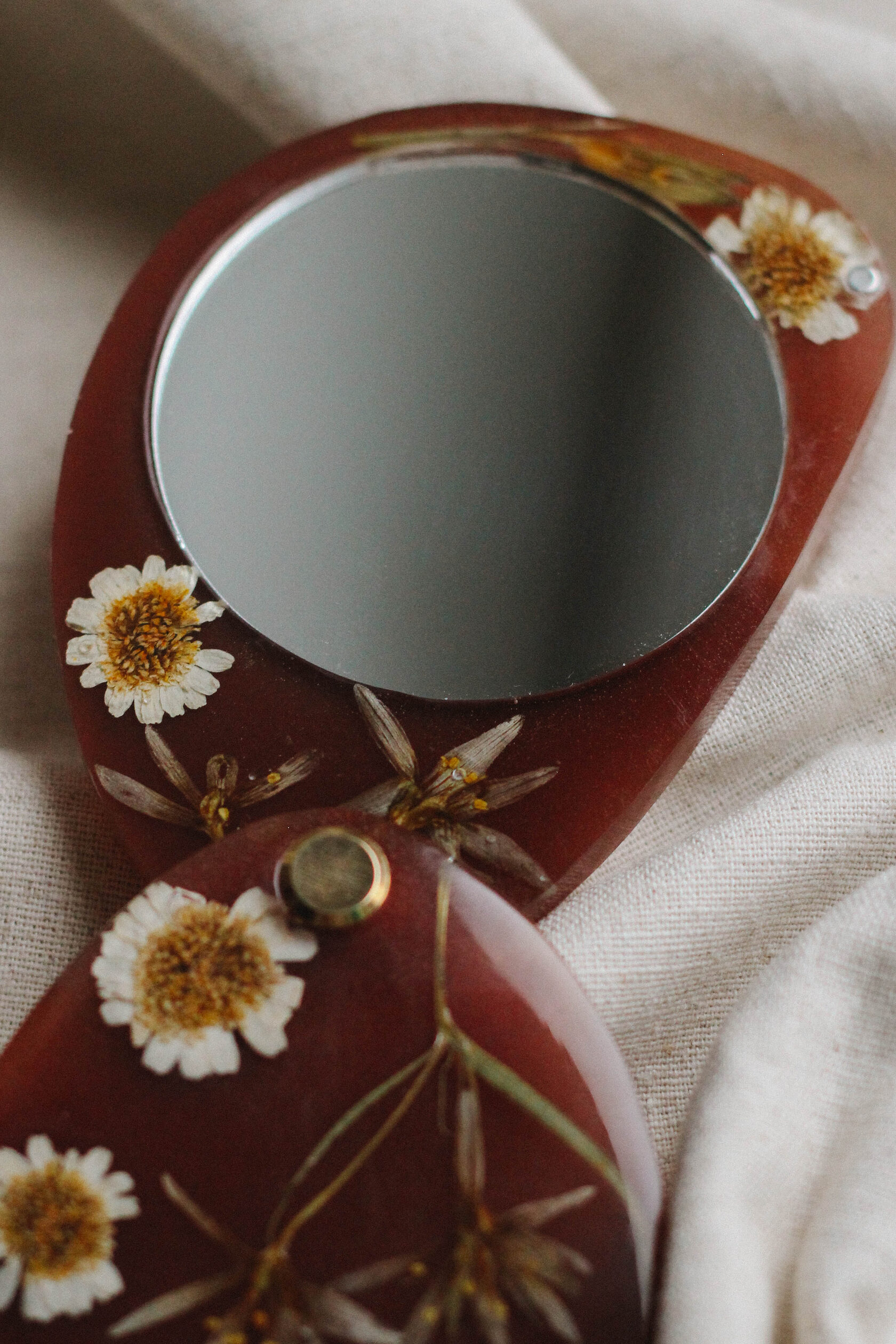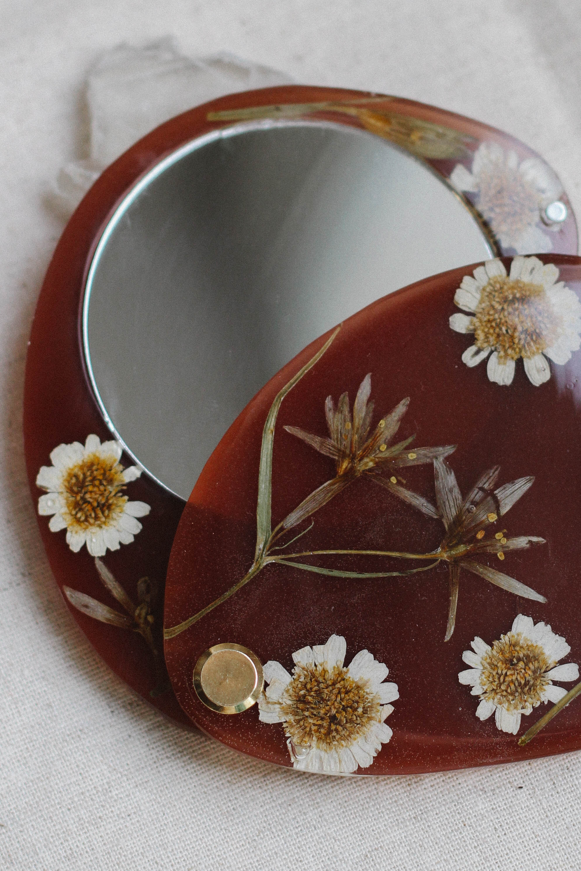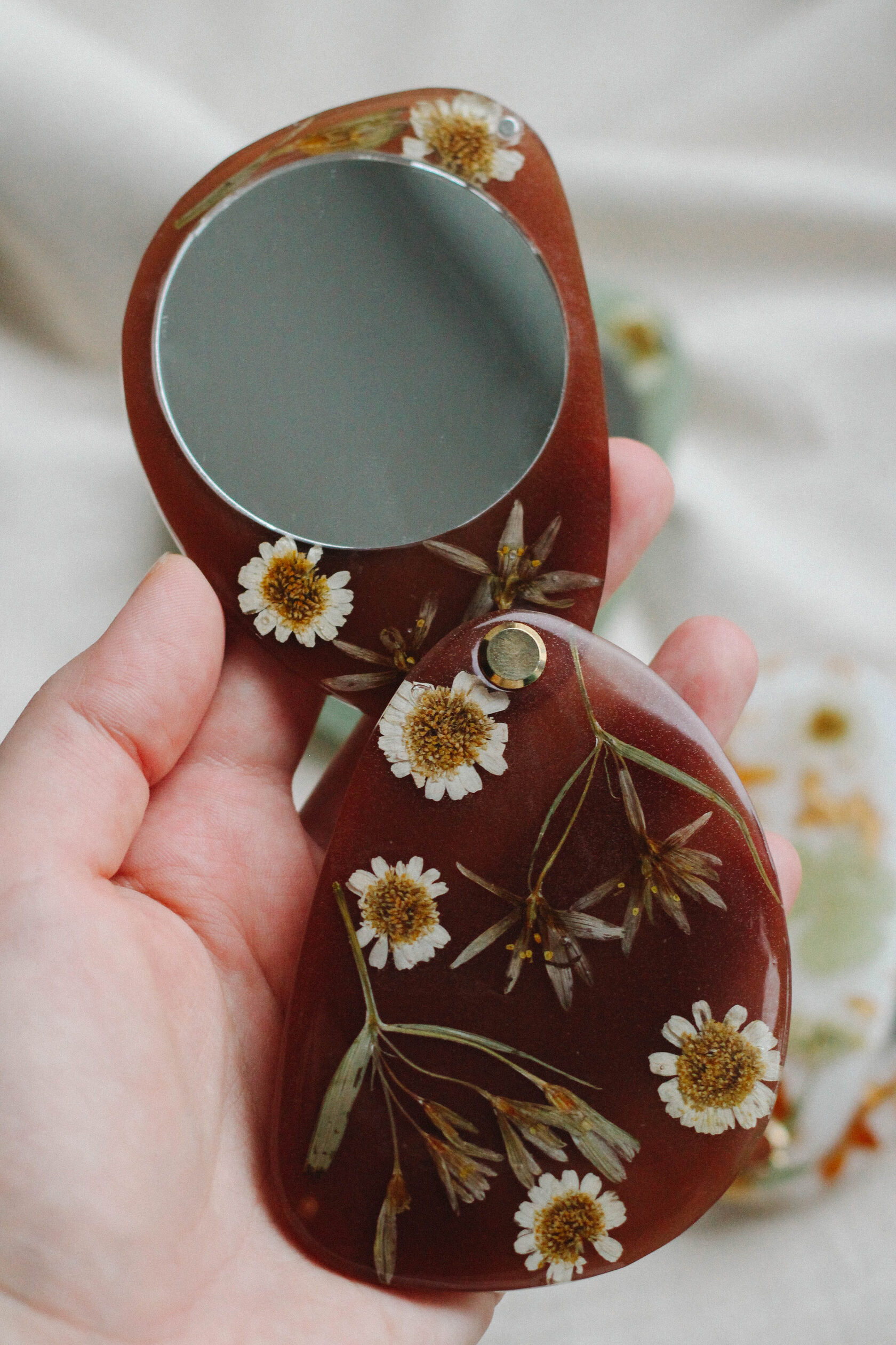 Мини зеркало из эпоксидной смолы- нежный аксессуар, в котором застыл кусочек летнего поля. Натуральные цветы ромашки и гейджии создают легкое настроение природы и уюта.