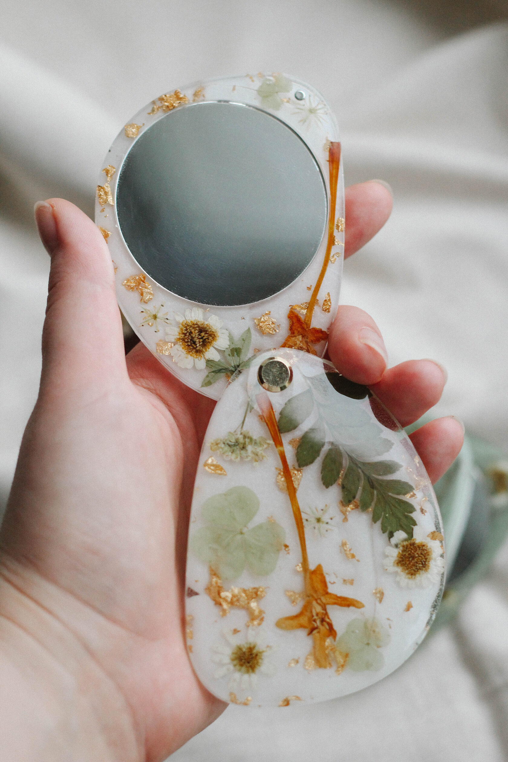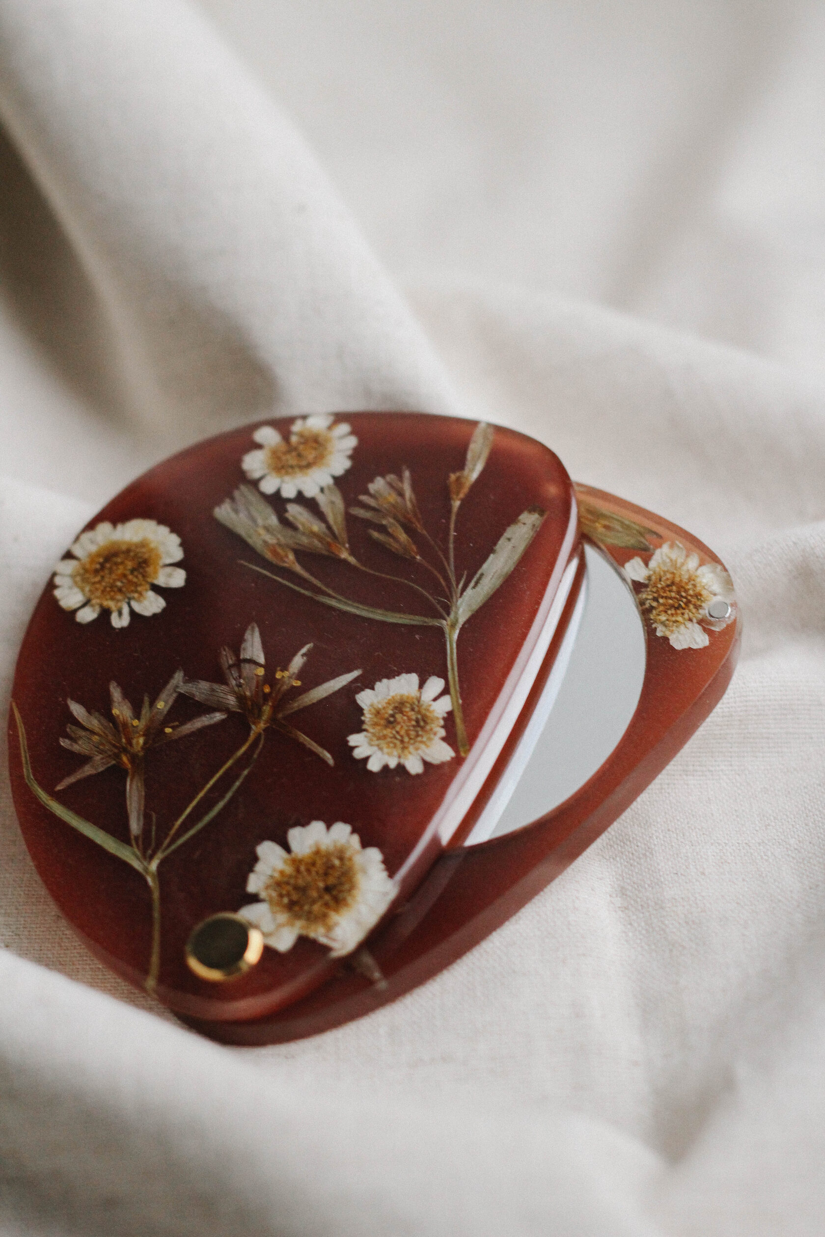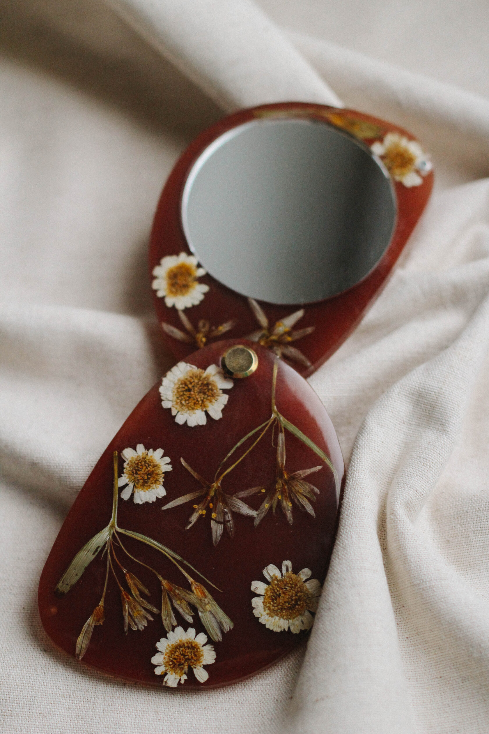 Мини зеркало из эпоксидной смолы- нежный аксессуар, в котором застыл кусочек летнего поля. Натуральные цветы ромашки и гейджии создают легкое настроение природы и уюта.